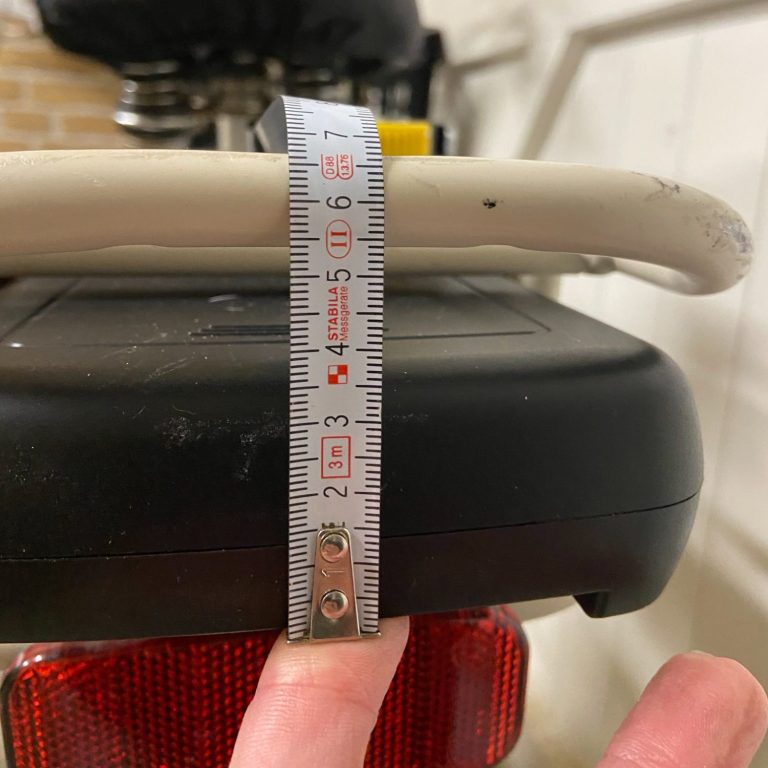 Belangrijk is om te meten hoeveel centimeter er zit tussen de bovenkant van de bagagedrager en de onderkant van het handvat van de accu. Zie de onderstaande foto als voorbeeld.