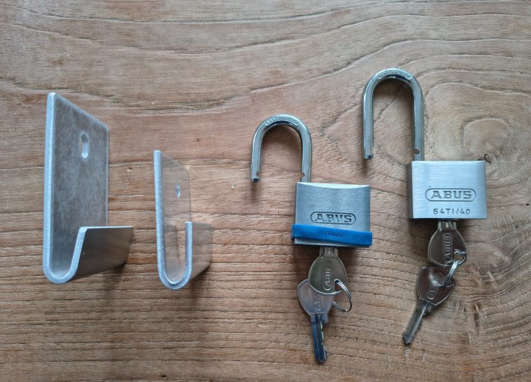 Het is super eenvoudig: een aluminium beugel in twee lengtes van 6 of 8 centimeter met een kort (2,5 cm boog) of een lang hangslot (4 cm boog). Dat is echt alles! En daardoor kost het niet meer dan 55 euro incl. BTW en gratis verzendkosten!!