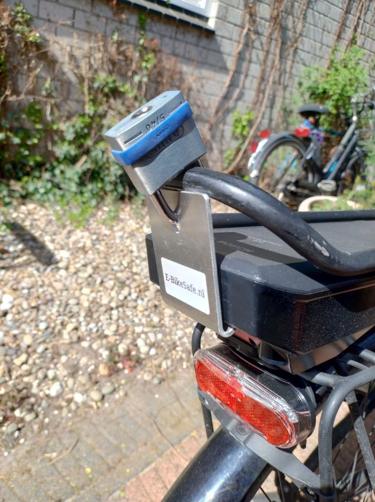 Het accuslot bestaat uit een aluminium beugel van 60 mm breed en 3 mm dik plus een Abus hangslot (security-level 5). Het uiteinde van de beugel doe je in het handvat van de accu en met het Abus hangslot verbind je de beugel aan de bovenliggende buis van de bagagedrager. Dus, doordat u het hangslot door het gat van de beugel haalt en daarna om de bovenliggende buis, heeft u de beugel verankerd met de bagagedrager.